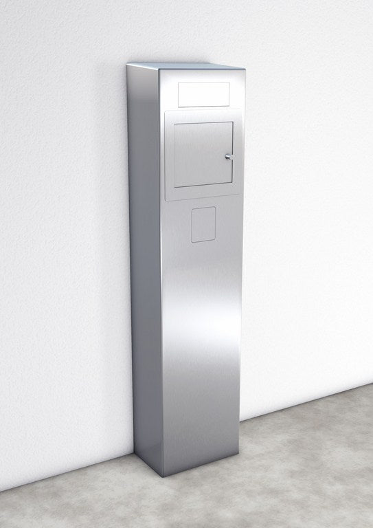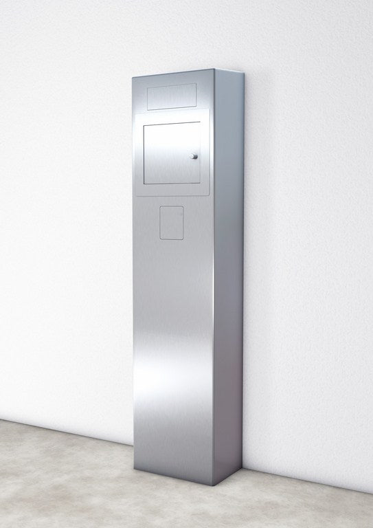 De zuil is vervaardigd uit hoogwaardig roestvrij staal met een gepolijste finish, wat zorgt voor een stijlvolle uitstraling en maximale weerbestendigheid. De afgeschuinde afdekking voert regen- en spatwater effectief af.
