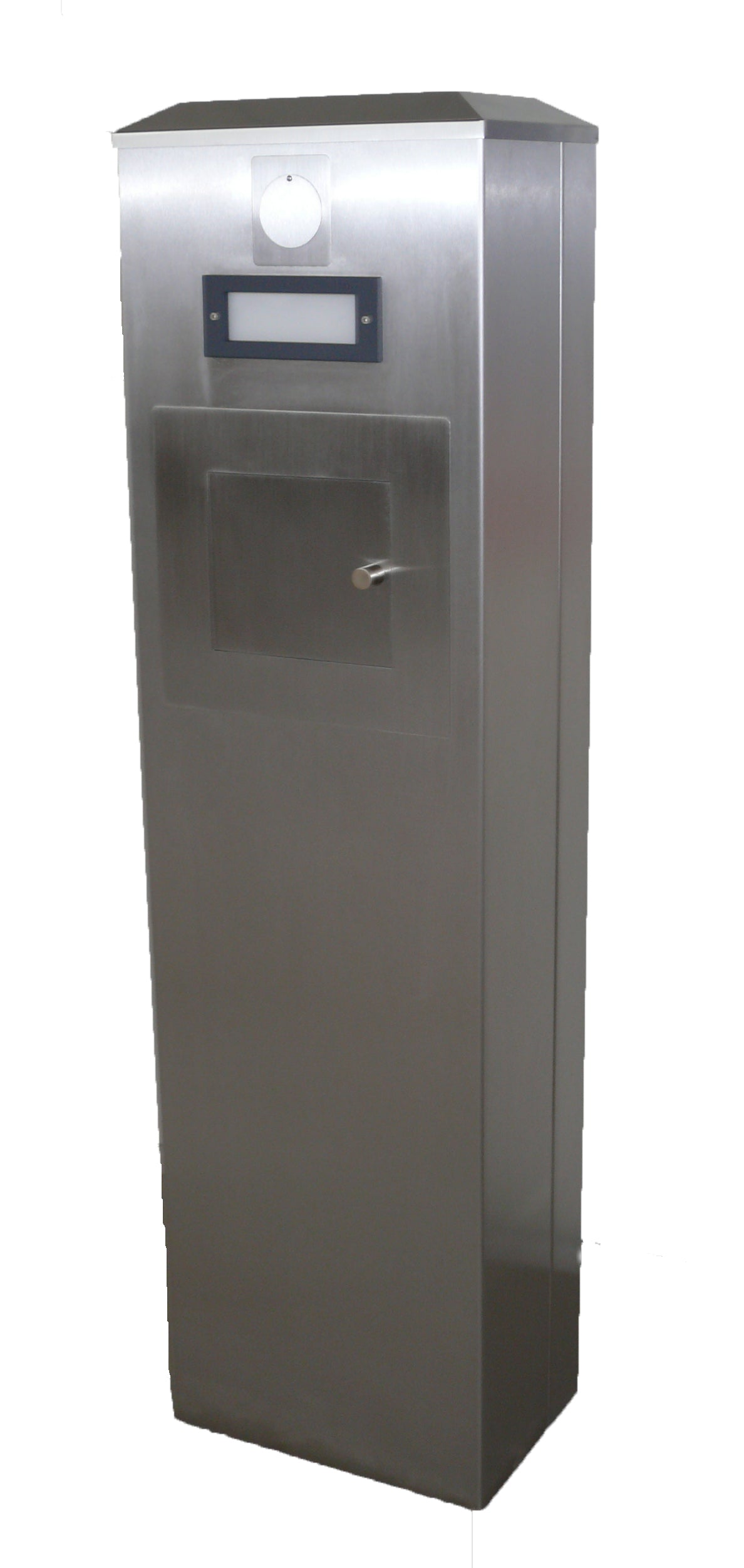 De zuil is vervaardigd uit hoogwaardig roestvrij staal met een gepolijst oppervlak, wat zorgt voor een elegante uitstraling en uitstekende weerbestendigheid. De afgeschuinde afdekking aan de zijkant bevordert de afvoer van spatwater en is voorzien van een vandaalbestendige clipsluiting.